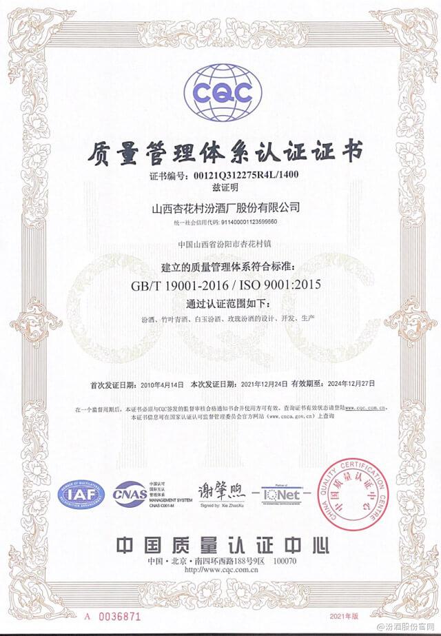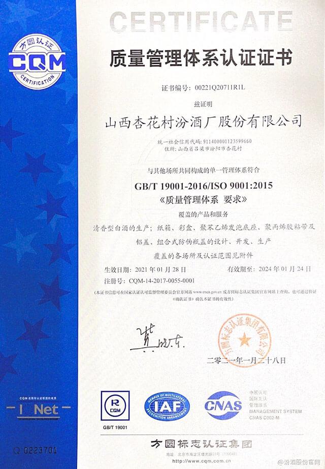 山西杏花村汾酒厂股份有限公司通过质量管理体系认证