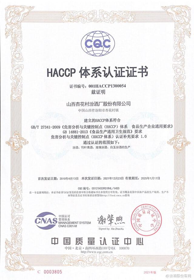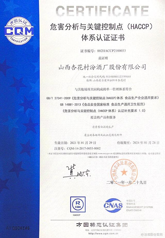 山西杏花村汾酒厂股份有限公司通过HACCP体系认证