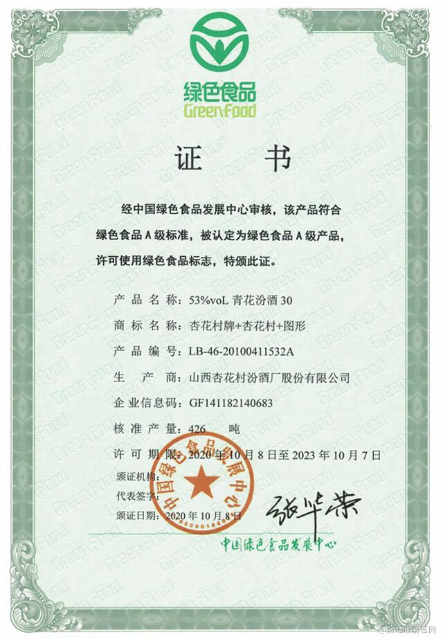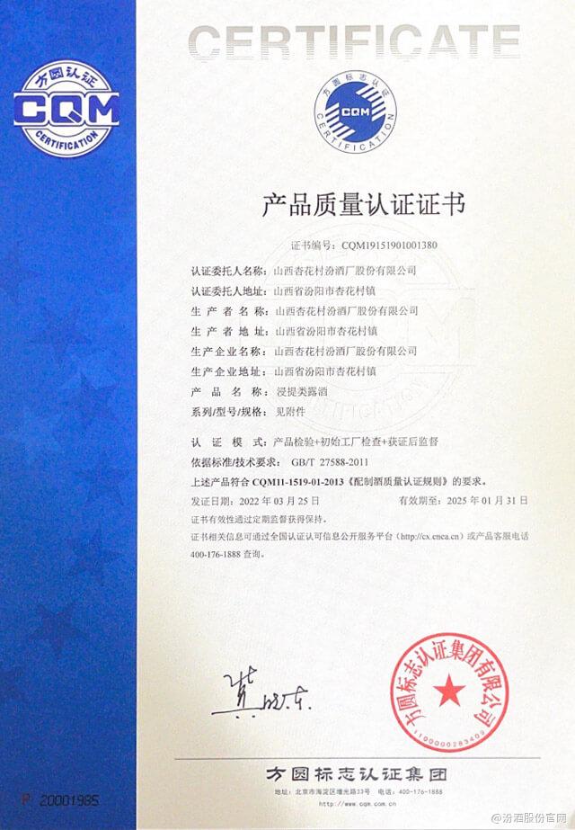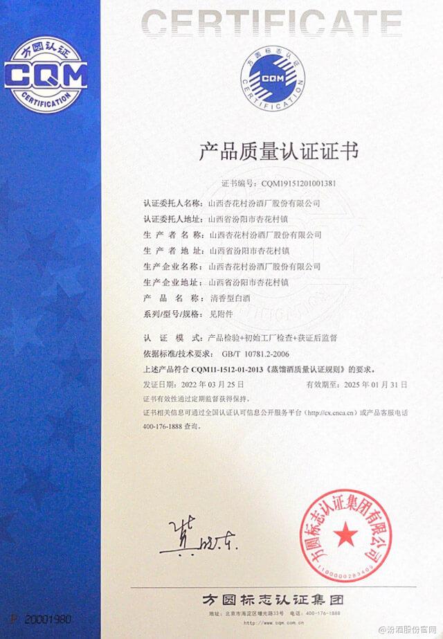 汾酒、竹叶青系列主导产品通过国家技术监督局质量认证办公室组织的产品质量认证,现为方圆标志认证集团有限公司的产品质量认证